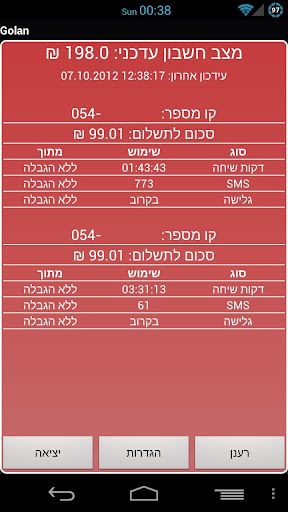אפליקציה לצפייה במצב החשבון החודשי בחברת גולן טלקום. אפליקציה זו לא פותחה ע"י החברה עצמה אלא בצורה עצמאית. האפליקציה מיועדת ללקוחות שני המסלולים (המוזל והללא הגבלה) ומאפשרת לכם לעקוב אחרי מצב החשבון העדכני של כל קו שברשותכם. בנוסף, ניתן לעקוב אחרי דקות שיחה, מספר הודעות ונתוני גלישה של כל קו.