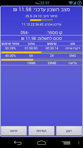 בפעם הראשונה שתיכנסו לאפליקציה תתבקשו להכניס שם משתמש וסיסמא (שקיבלתם מגולן טלקום) ופרטים אלו ישמרו אך ורק במכשירכם. בכניסות הבאות לא תצטרכו להכניס פרטי משתמש והאפליקציה תדע לבד להכניס אותם מזיכרון הפלאפון. ניתן לנתק את החשבון מהאפליקציה בכל עת דרך ההגדרות - שימושי במקרה של שינוי סיסמא או כאשר רוצים לבדוק חשבונות אחרים. בנוסף ניתן להציג את החשבון החודשי עם או בלי מע"מ גם דרך ההגדרות. הפרטים שמופיעים לקוחים מהחשבון שלכם באתר גולן טלקום. אני לא מתחייב שהמידע המוצג הוא באמת העדכני ביותר והוא יכול גם להיות שגוי... זה כבר תלוי בתפקוד האתר של גולן טלקום.